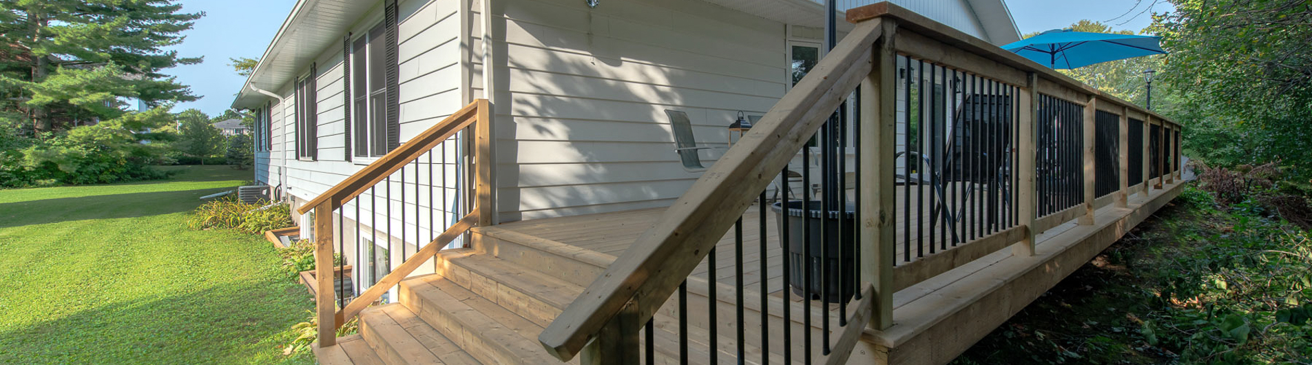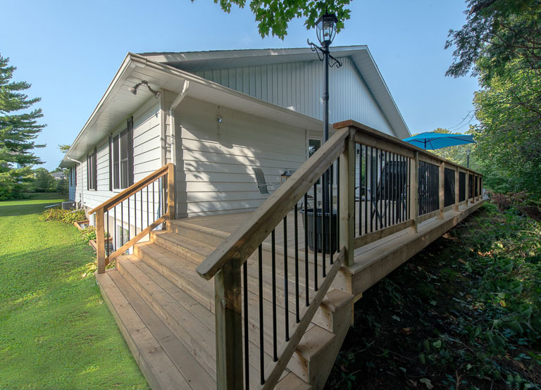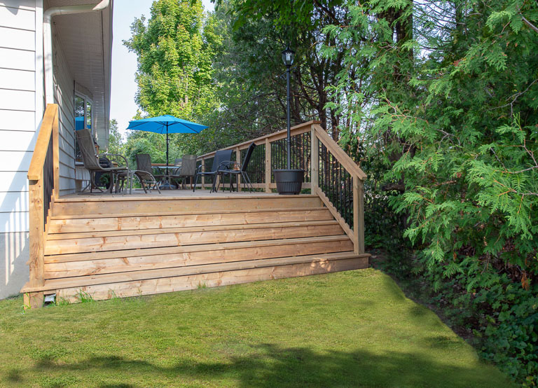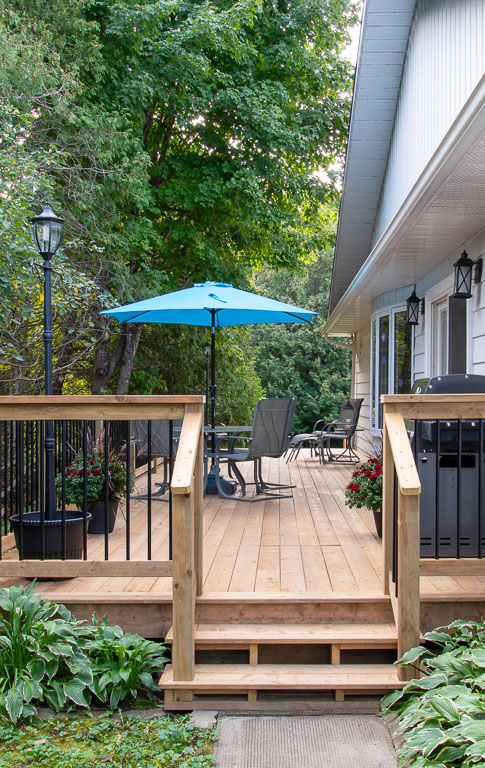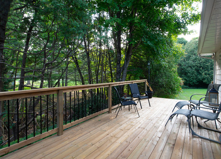 We replaced the aging, undersized deck with a spacious pressure-treated structure designed for both style and longevity. The new deck features clean-lined railings with black metal balusters that add a modern touch while maintaining open sightlines to the surrounding trees.