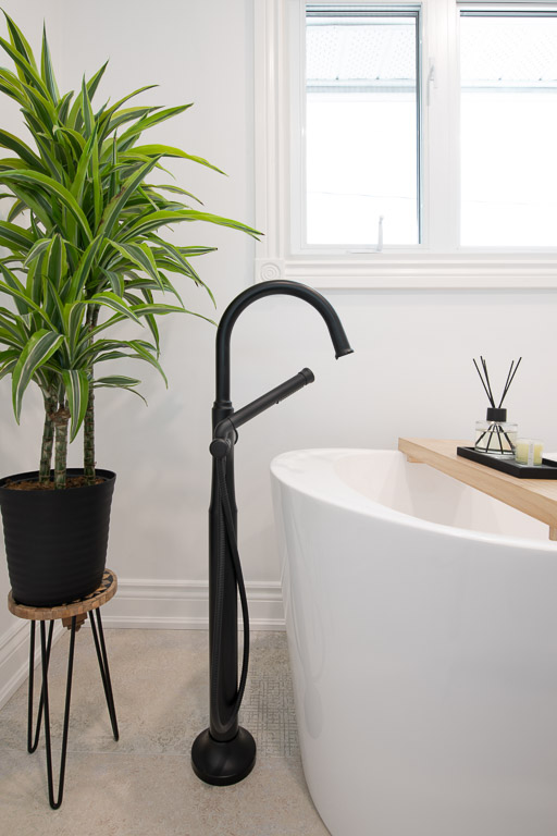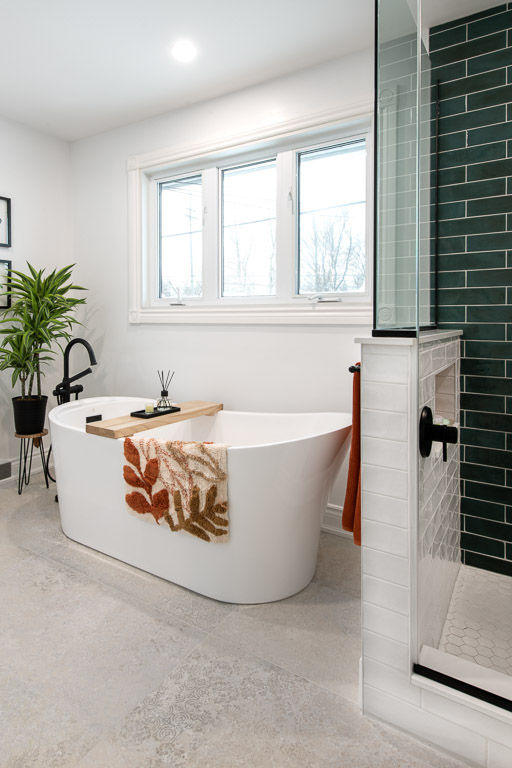 We reconfigured the existing footprint to create three distinct yet connected zones: a serene bedroom, a spa-inspired main bathroom, and a custom walk-in dressing area. By removing an unused guest room and undersized bathroom, we designed a generous bath with a soaker tub positioned beneath the window, a streamlined shower with concealed storage, and a dressing space with fully integrated cabinetry.