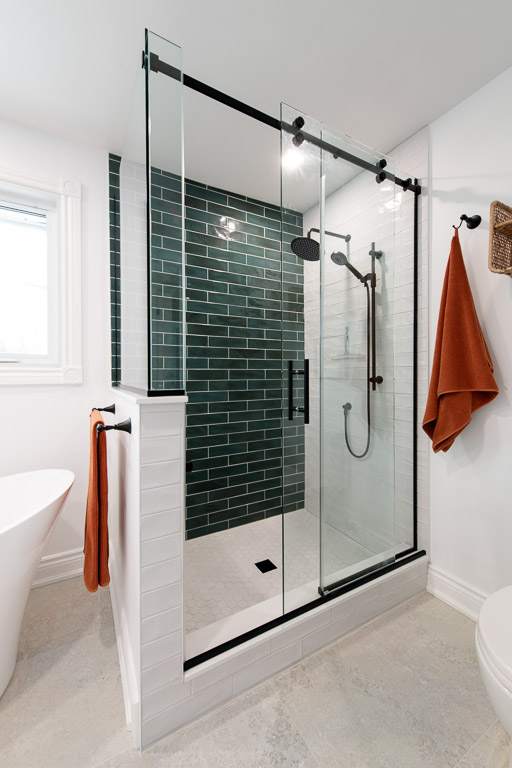 Customized IKEA wardrobe systems were elevated with trim, filler panels, and thoughtful layout adjustments to achieve a built-in look while respecting budget. Throughout, we maintained a consistent palette of warm whites, oak tones, muted greens, and matte black accents, refinishing and extending the existing hardwood into the new closet to unify the spaces. The result is a calm, functional retreat that balances comfort, storage, and timeless appeal.