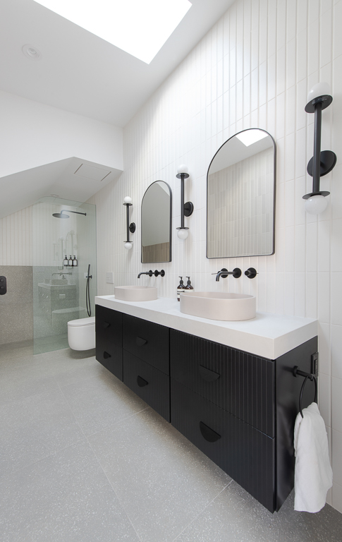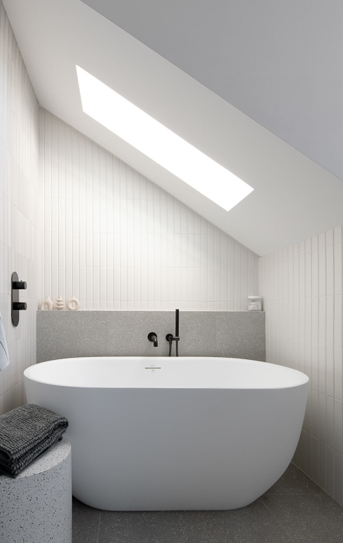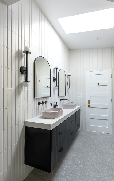 We stabilized the foundation with repurposed railroad steel, an innovative engineering solution that preserved structural integrity without lifting the home. Inside, we reimagined the second-floor layout by transforming attic space into storage, converting a closet into a full bathroom, adding a walk-in closet and ensuite for the primary bedroom, and relocating the laundry upstairs. Skylights in every bathroom and throughout the hall flood the home with natural light, while wall-hung vanities and toilets save valuable floor space and maintain a sleek appearance. Together, these choices created a brighter, more functional home that respects its character while embracing modern living.