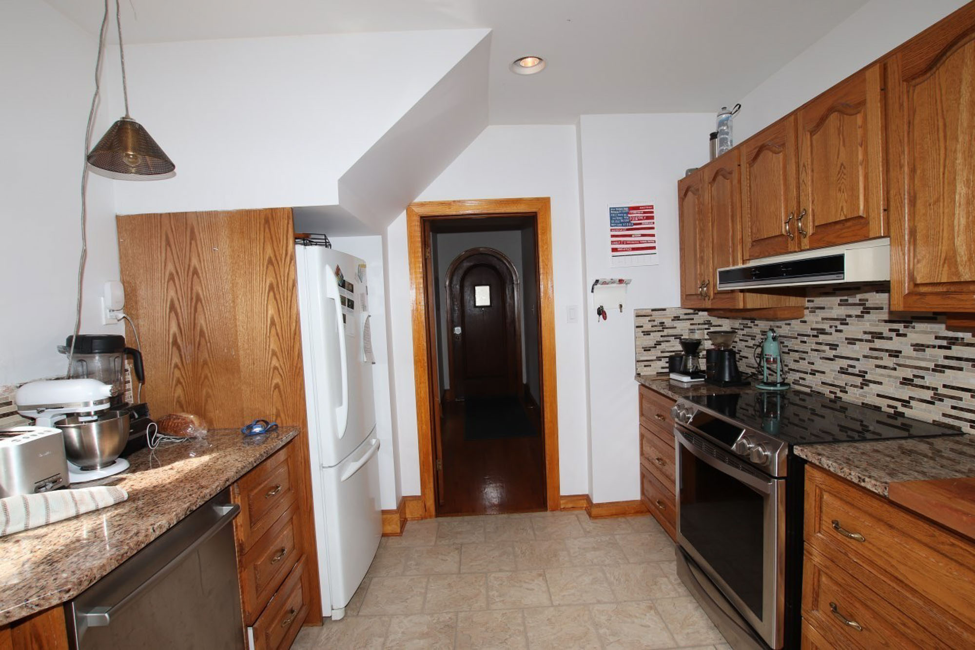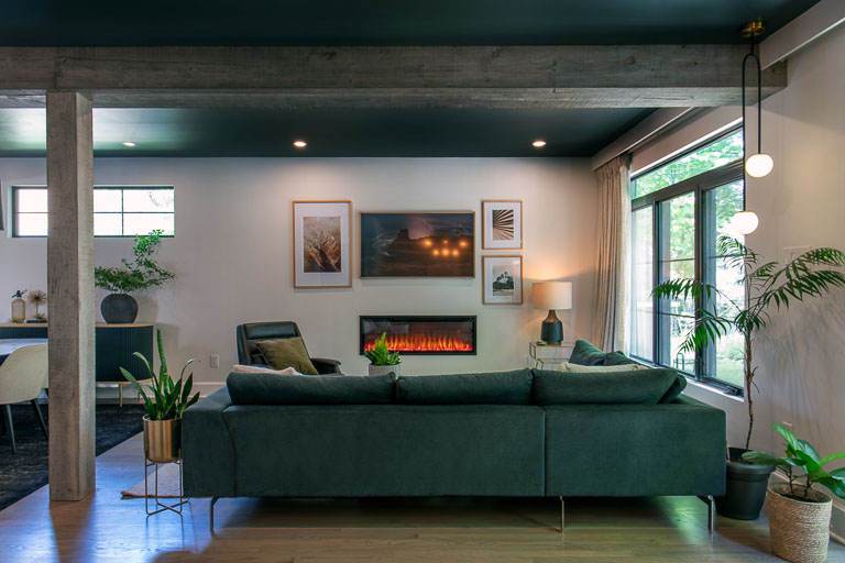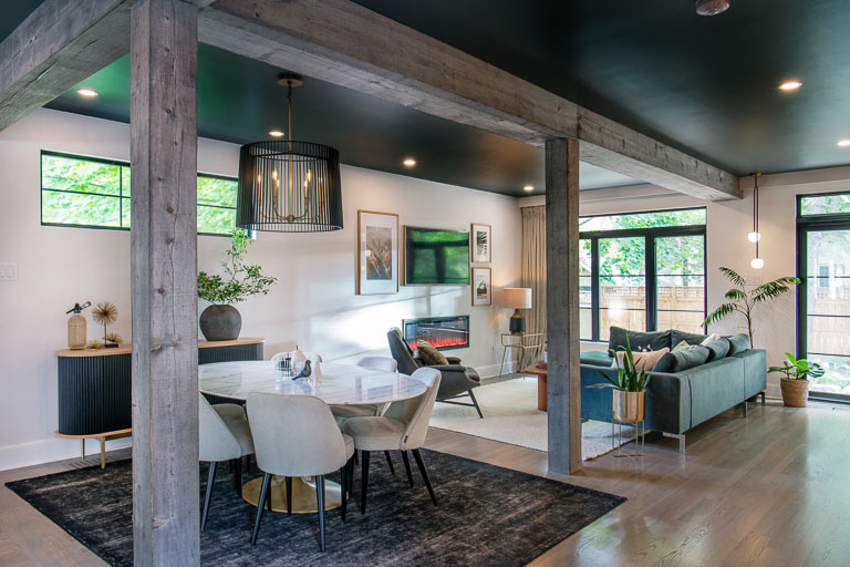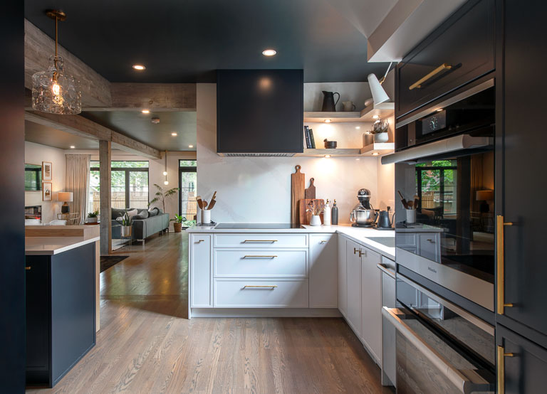 Design choices emphasize both elegance and cohesion. Barnboard-clad beams subtly define the open space, while shaker cabinetry in Starry Night, Satin White, and birch tones pairs with dual quartz countertops in contrasting light and dark. Black and gold fixtures add sophistication, complemented by birch shelving, glass displays, and panel-ready appliances. Natural light, LED pot lights, and newly blended hardwood unify the home’s character with modern functionality. The result is an expansive kitchen renovation that feels both dramatic and inviting, perfectly suited for gathering, cooking, and creating memories.