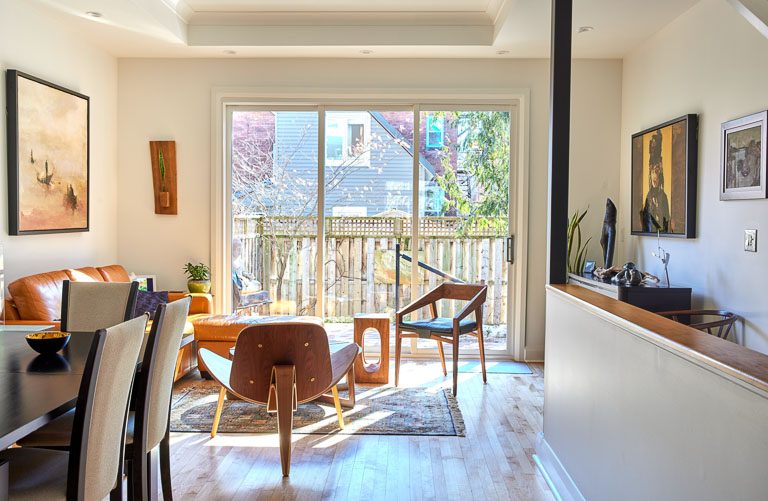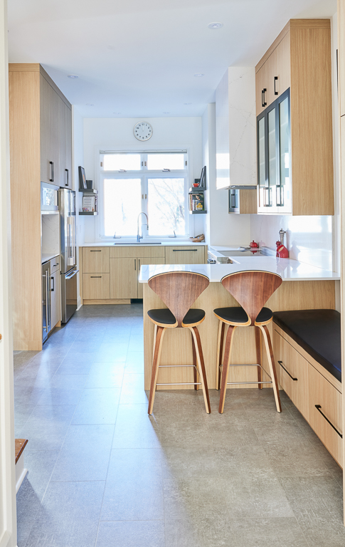 We approached this main floor renovation with the goal of improving flow and usability while introducing bold, modern style. The kitchen was reorganized with the sink positioned to overlook a window, the fridge aligned with cabinetry, and additional counter space created. A custom beverage station near the fridge supports entertaining, while the entryway gained a bench with hidden storage and a wardrobe lift for off-season items. We improved the flow in the living room by relocating a structural post and replacing the traditional doors with a double slider patio door that brings in abundant natural light.