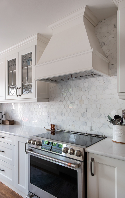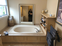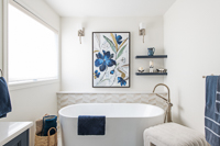 The bathroom was reimagined as a brighter, more open retreat by replacing full walls with half walls and glass, creating a layout that feels spacious and inviting. A boxed-in tub gave way to a freestanding design paired with a tiled feature wall and floor-mounted faucet, forming a striking focal point. The relocation of the shower fixtures allowed for a larger footprint, while niches and a full linen closet provide tailored storage. A refined palette of neutrals, brushed nickel fixtures, floating shelves, and quartz ledges presents both elegance and practicality. Every element—from hexagon floor tiles selected for safety to the carefully coordinated finishes—works together to create a cohesive, spa-inspired space that blends function with luxury.