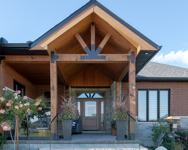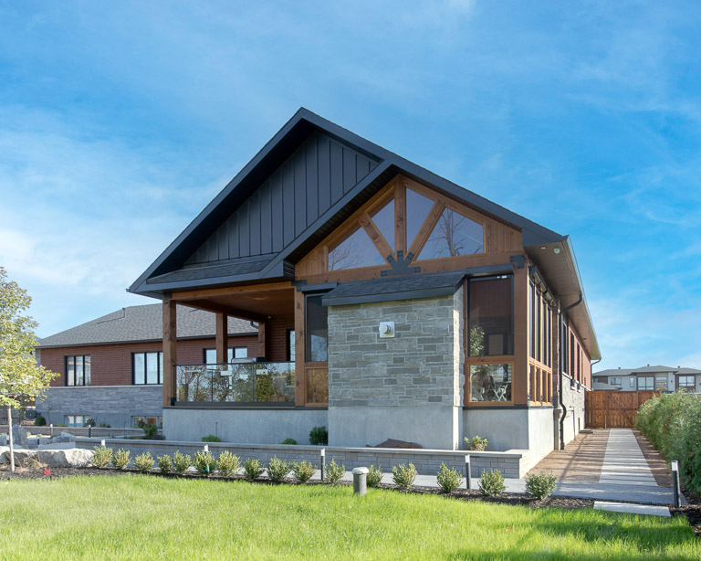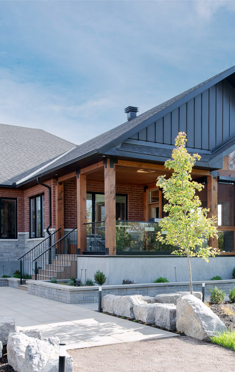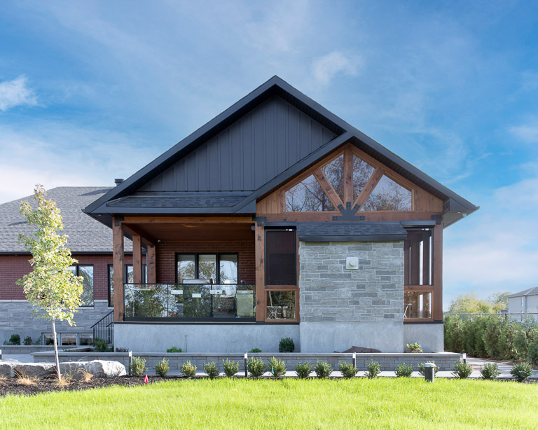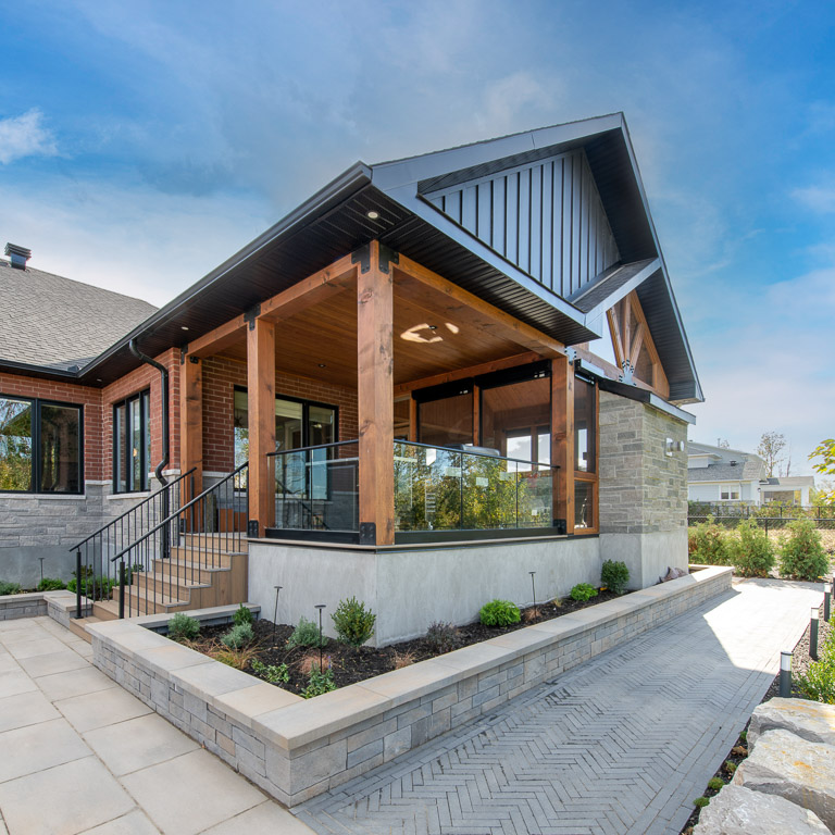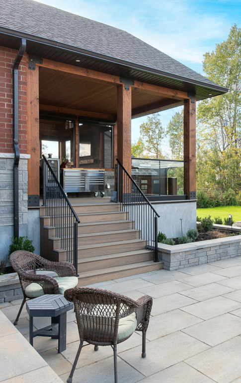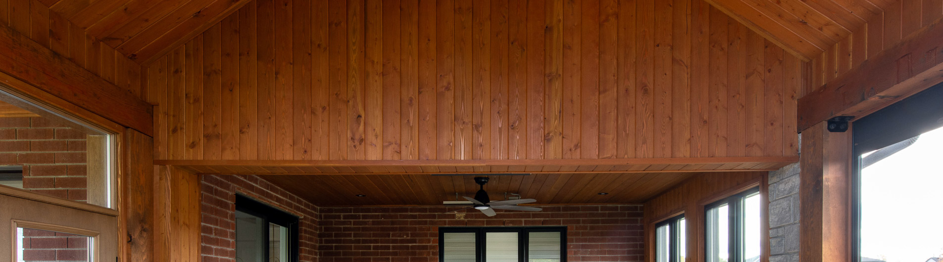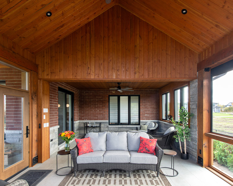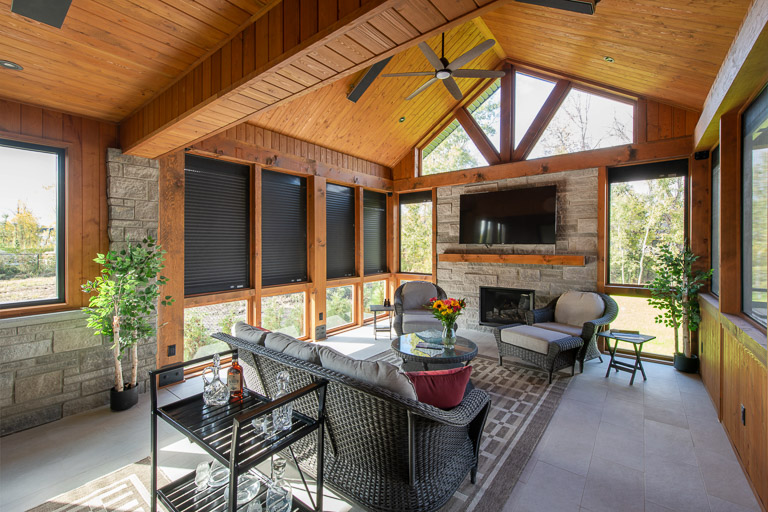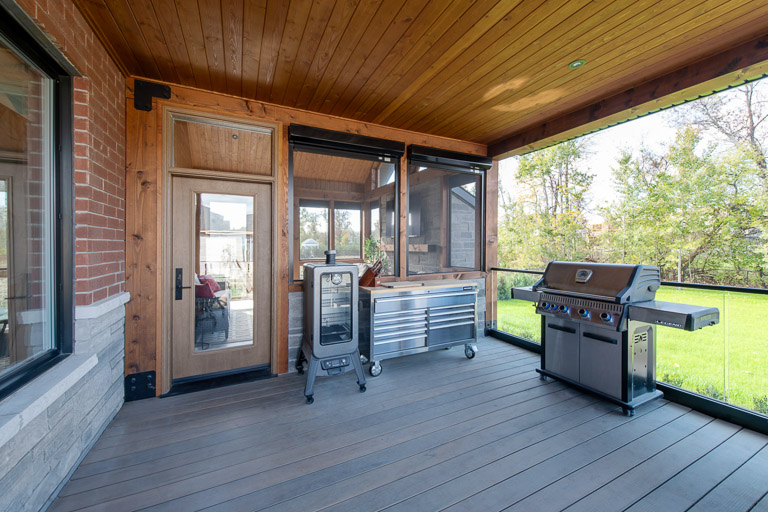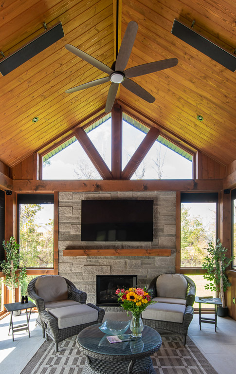We reimagined the existing deck as a warm, lodge-inspired living space that balances structure, comfort, and connection to the outdoors. A cedar-clad cathedral ceiling with exposed timber framing introduces natural character, while a full-height stone fireplace anchors the room and provides heat for cooler months. Custom-fit three-season windows and retractable screens offer flexibility, allowing the space to shift easily between open-air and enclosed use. The layout supports both lounging and dining, with a seamless transition to a covered BBQ area designed for all-weather cooking. Durable materials—including porcelain tile, aluminum framing, cedar, and stone—were selected to withstand the elements while maintaining a cohesive look with the home’s exterior. Structural upgrades to beams, posts, and footings ensure long-term performance, resulting in a space that feels both grounded and adaptable—built for gathering, relaxing, and extending time spent outdoors.