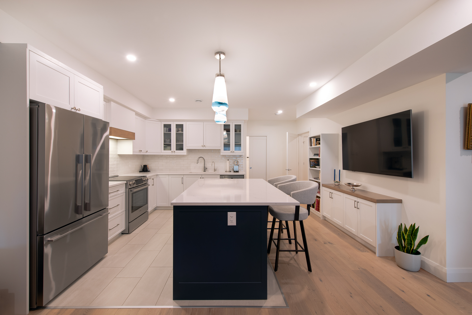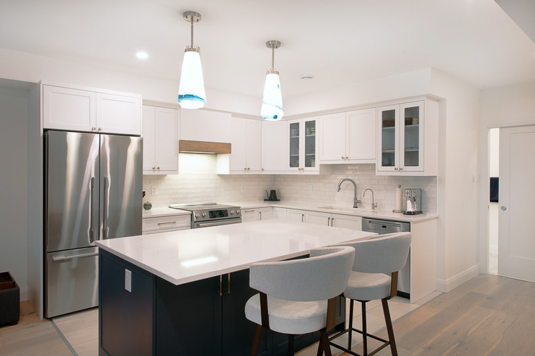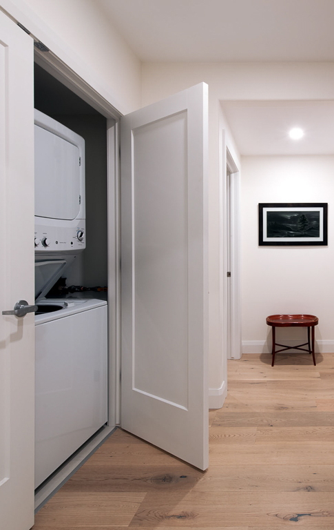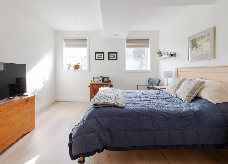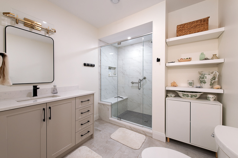 Cohesion is evident in a refined palette of warm greys, soft whites, and matte black accents, which are echoed throughout the cabinetry, hardware, and fixtures. The kitchen anchors the suite with custom flat-panel cabinetry and a full-height quartz backsplash. In the bathroom, we achieved spa-like simplicity through a curbless shower, floating vanity, and quartz surfaces. A fully autonomous mechanical system, barrier-free thresholds, and wide clearances future-proof the space, ensuring adaptability for tenants, caregivers, and family. The result is an ADU basement suite that feels bright, modern, and welcoming, designed to support independence today and flexibility for the future.