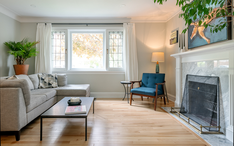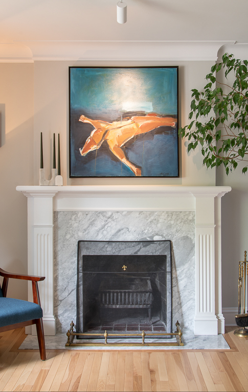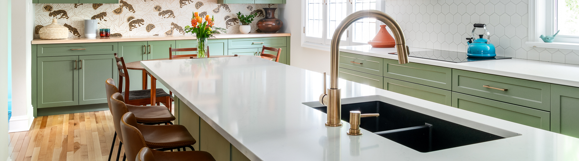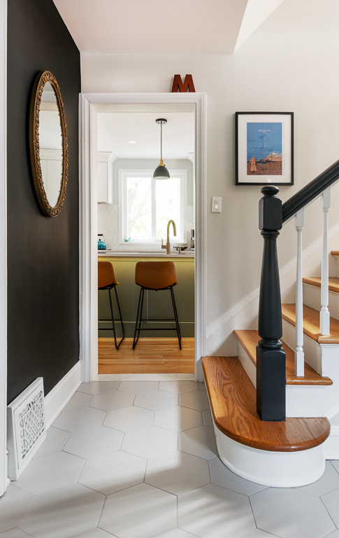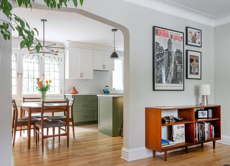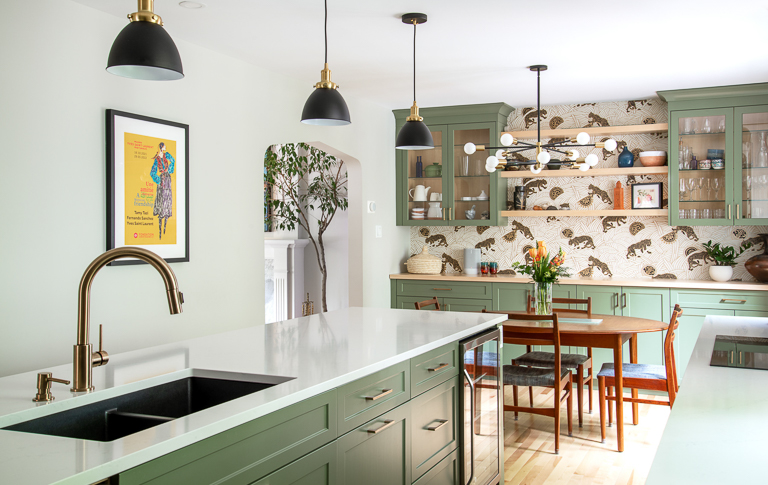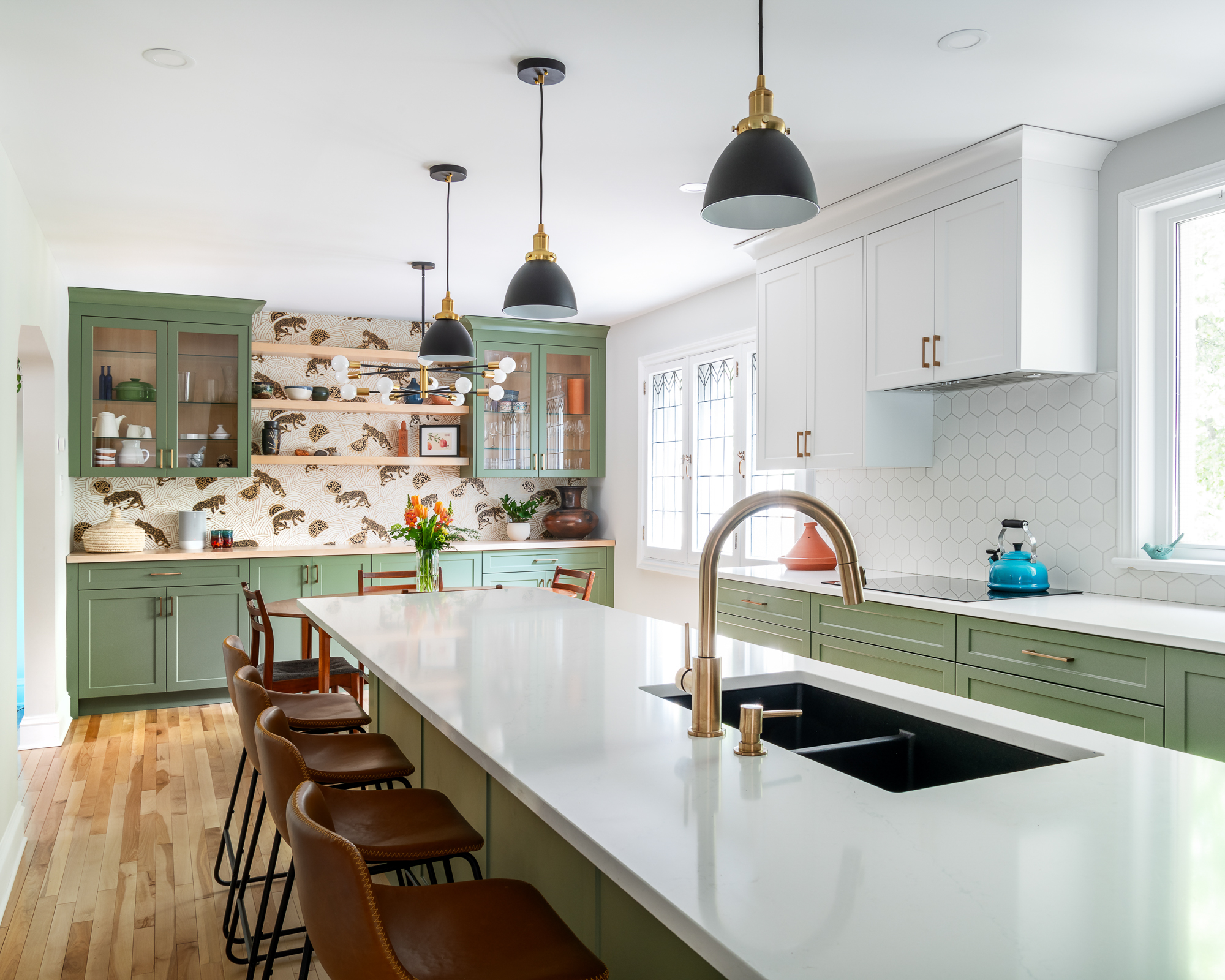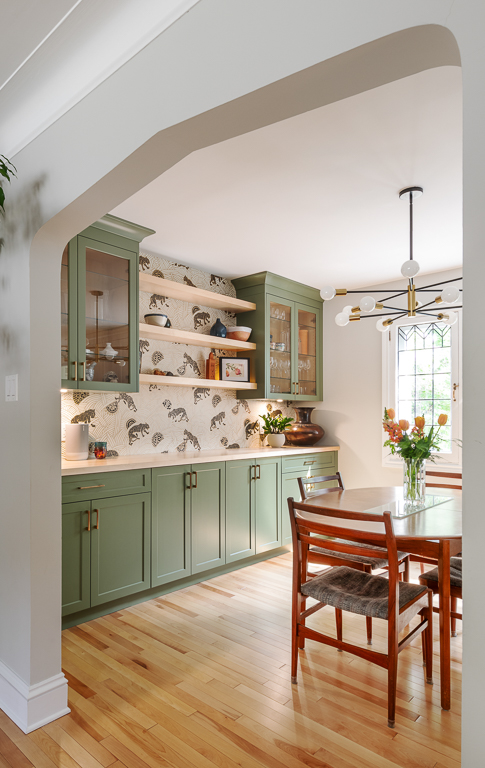 Bold design choices give the home its character. A mix of green and white shaker cabinetry, gold hardware, and warm wood accents creates a sophisticated yet playful palette, tied together by patterned hexagon tiles and black-and-gold detailing. Jaguar wallpaper introduces a focal point visible from multiple rooms, while the updated fireplace surround brings warmth and continuity to the adjacent living room. We carefully preserved the original stucco ceiling detail, which echoed in the full-height cabinetry. The mudroom, on the other hand, flips the palette with white millwork, large hexagon tiles, and green-painted walls. The result is a cohesive main floor that balances timeless design with unique personal touches—modern, functional, and full of character.