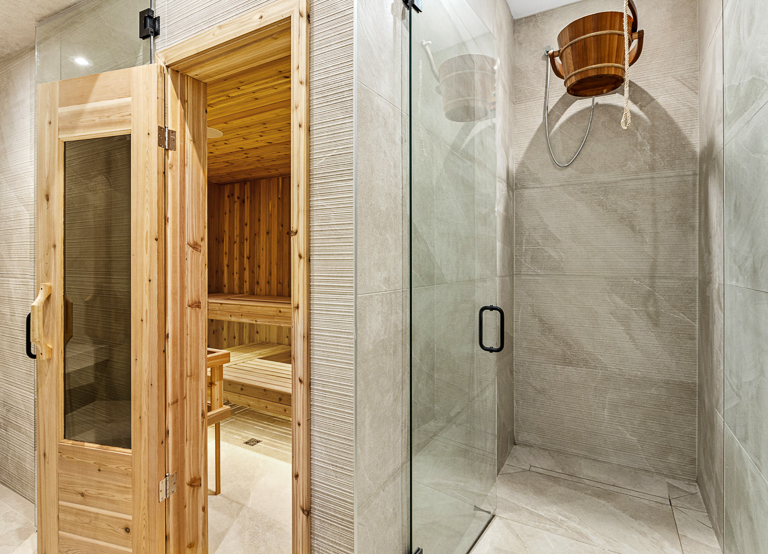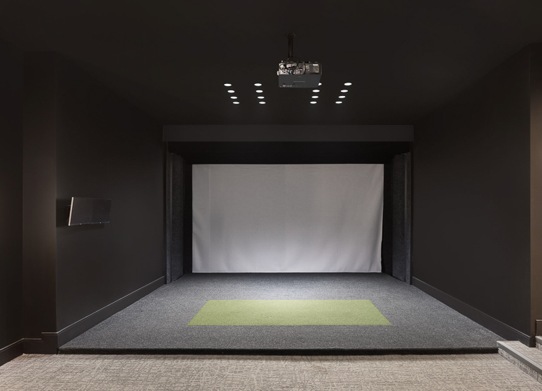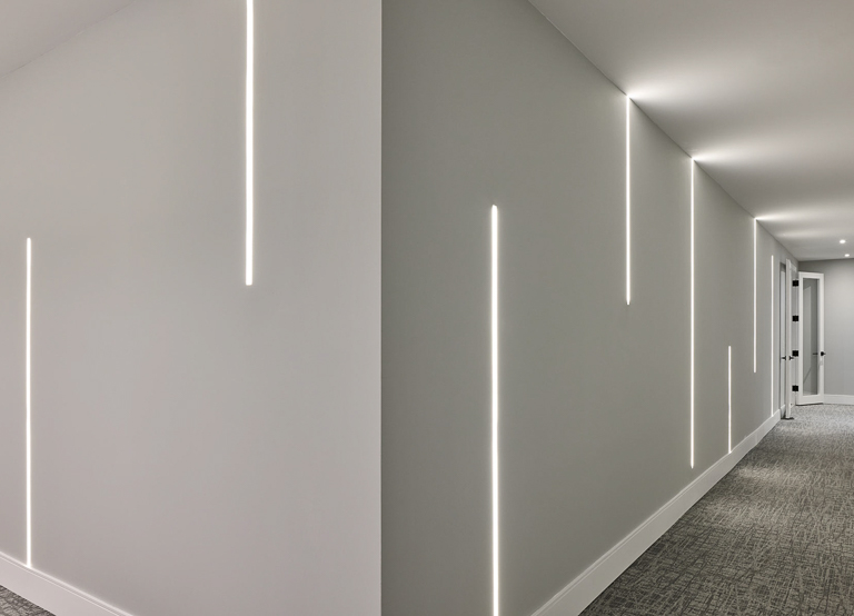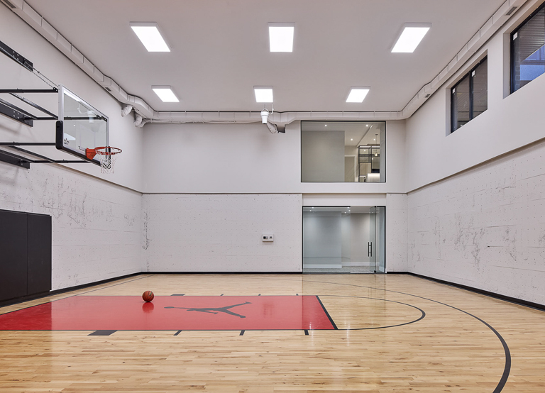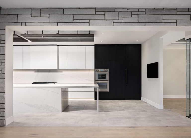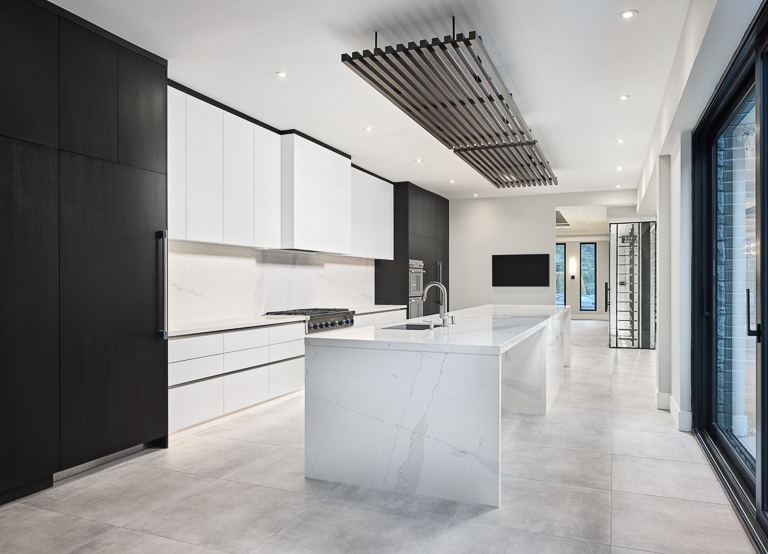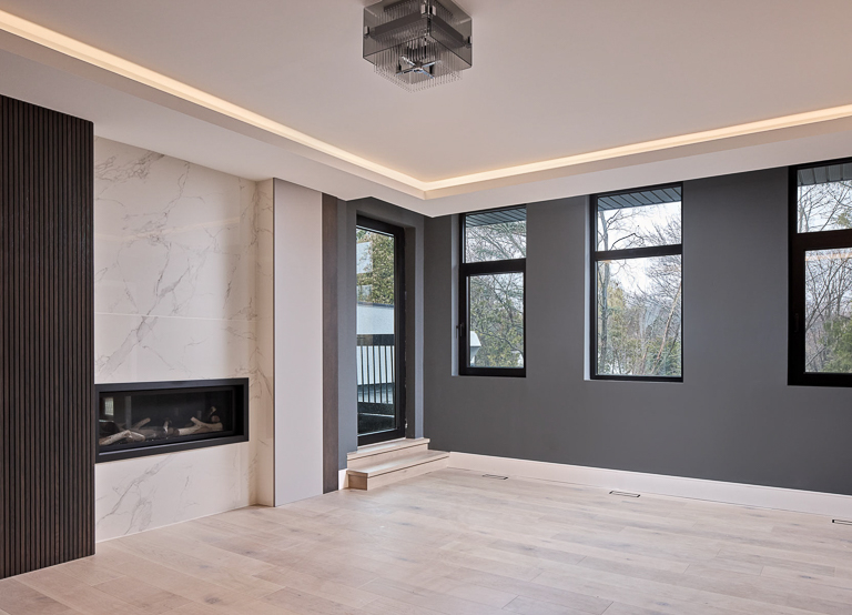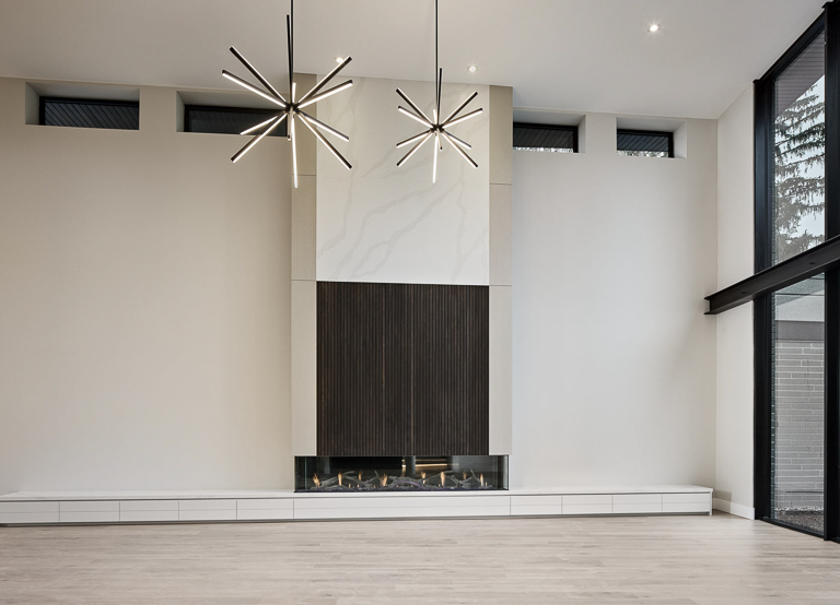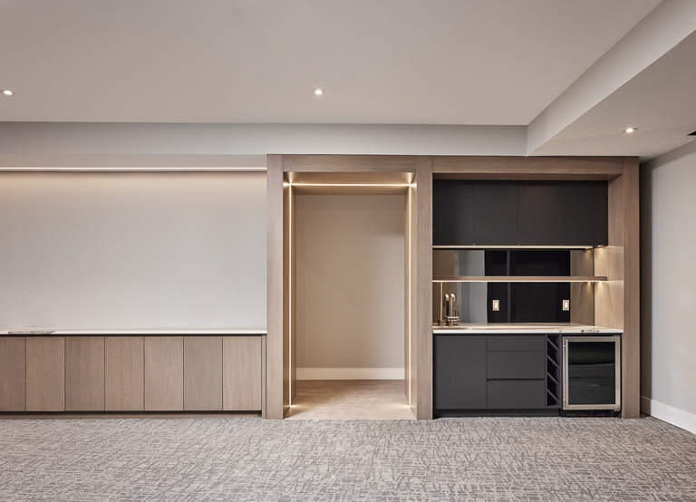 We approached the design of this home with a focus on both scale and intimacy. The main floor establishes a dramatic sense of arrival, with a processional hallway leading to a grand hall anchored by a custom slat wood wall, glass fireplace, and soaring two-storey windows. From there, retractable glass walls connect the show kitchen and bar to the future pool terrace, while a hidden working kitchen, climate-controlled wine room, and custom bar enhance functionality. Upstairs, the layout is divided into a private primary suite, a children’s wing, and an integrated office overlooking the backyard. The basement expands into a private sports and recreation complex with a basketball court, spa-style locker room, golf simulator, and theatre.