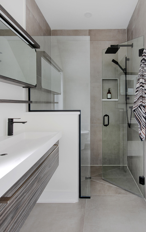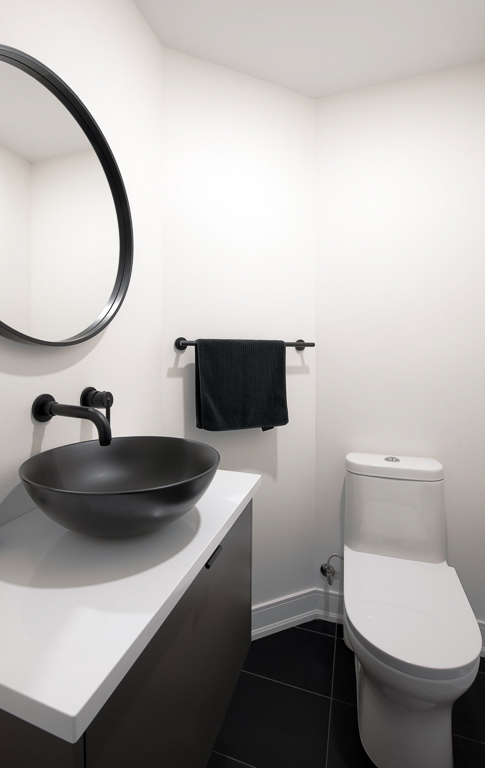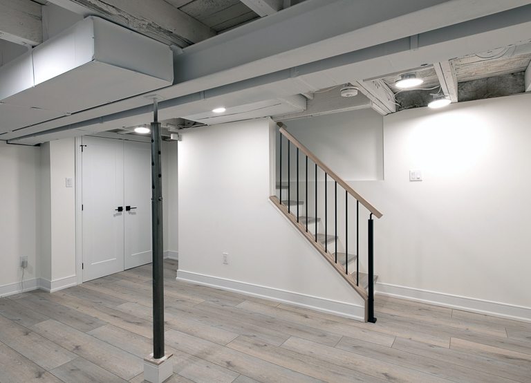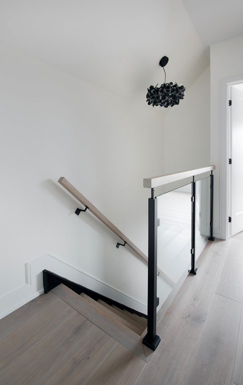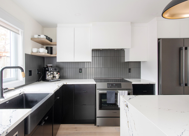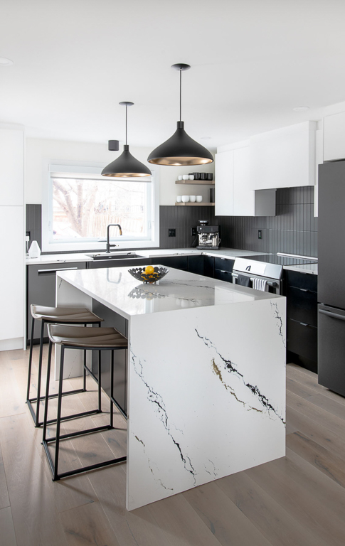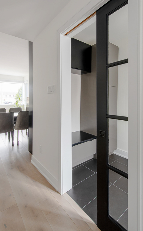 Guided by cohesion and clarity, this wartime home renovation combined a crisp black-and-white palette, French-cut white oak floors, waterfall quartz countertops, and subtle repeating textures that tie the design together seamlessly. We also planned for both function and longevity through stacked closets designed for future elevator access, a compact mudroom-style back entry, and thoughtful upgrades like spray foam insulation, energy-efficient windows, and waterproofed basement storage. Together, these choices create a future-ready home that strikes bold style and lasting comfort.
